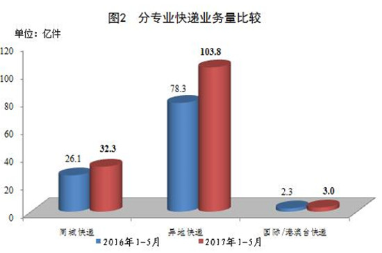 1-5月,同城、异地、国际/港澳台快递业务量分别占全部快递业务量的23.3%、74.6%和2.1%;业务收入分别占全部快递收入的14.2%、51%和11.1%。与去年同期相比,同城快递业务量的比重下降1.2个百分点,异地快递业务量的比重上升1.3个百分点,国际/港澳台业务量的比重下降0.1个百分点。